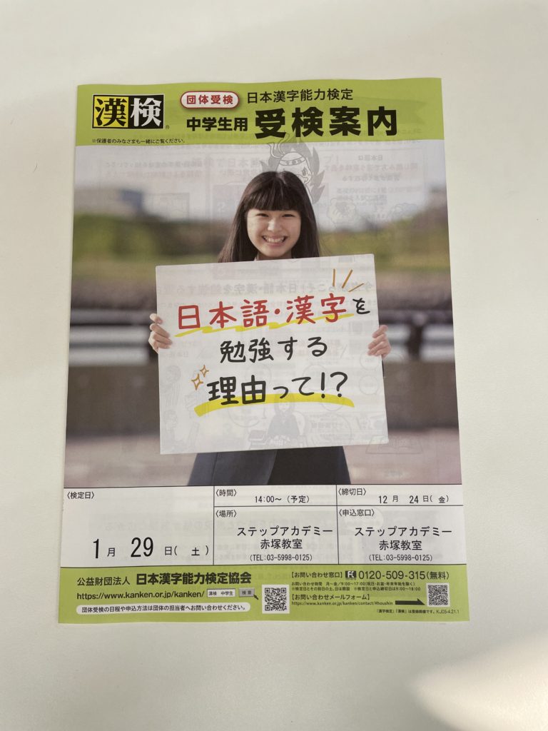 さて、11/1より第三回「日本漢字能力検定(漢検)」と「実用英語技能検定(英検)」の受付が開始しております!教室内の案内も第三回のものにさし変わっているので、是非検討してみてくださいね!そんな受験案内ですが、協会のほうから送られてくる時点では実は受験日や申込日時が記入されていない状態です。会場によって受付日時や実施日が違うので、各会場で記入することになります。ステップアカデミーでは日時と、ちょっとした遊び心でステップ君がうっすら印刷されています🐔(気づいていた人、いますか⁈)しかも、漢検の受験案内は小学生・中学生・高校生・一般と4種類ものステップ君が!いるはずだったのですが…