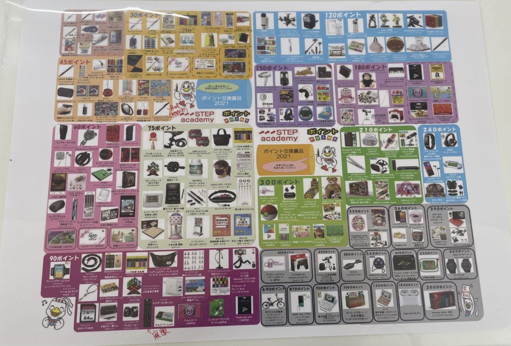 そんな皆さんの頑張りが、景品として還元されるという素晴らしいシステムがステップアカデミーにはあるんです!その名も「ポイント制度」。なんと塾に来るだけで1日1ポイント貯まってしまう、授業中にもポイントが貯まる、巡回指導を頑張ったらまとめてポイントがもらえる可能性まで出てくるという、大盤振る舞い状態の制度です😂ただ重要なのは、そのポイントで何がもらえるのか。「どうせちゃちい塾の名前が入ったペンとかでしょ?」なんて思われているそこのあなた!見てびっくり、なんとこんなにラインナップが充実しているんです!