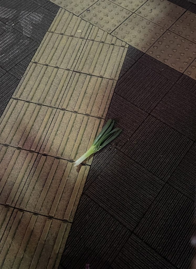 これが実際の現場です。無機質に切り落とされたネギが横たわっています。いったい誰がこの形で落としていったのでしょうか…年末が近づいてきて鴨そばの消費量が増えることを危惧した鴨が背負っていたものが落ちたのかしら、なんてかわいくも残酷な想像を働かせてみたりしました(奇遇にも目の前が蕎麦屋チェーンでしたので😅)